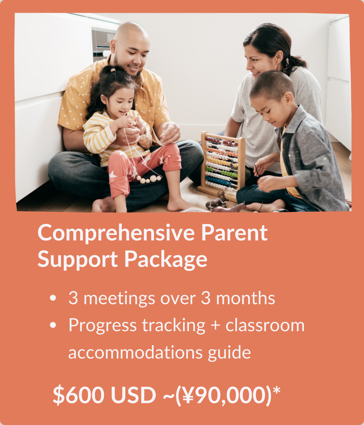 A focused, no-pressure video session for caregivers. You’ll share your concerns; Aya listens, explains what she’s seeing, and offers practical, tailored strategies for home/school routines—plus resources and suggested next steps. You’ll receive a brief summary after the call.
